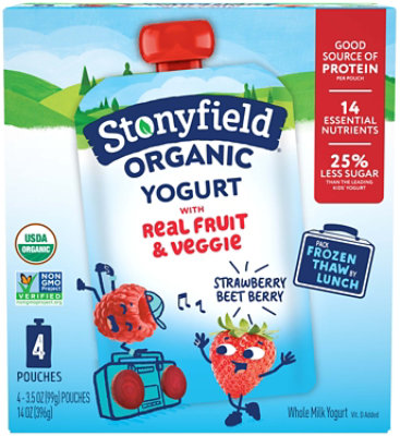 Yoplait kid yogurt spongebob squarepants variety pack of strawberry and strawberry banana yogurt value pack 8 cups 4 0 oz each 4 7 out of 5 stars 25 37. Stonyfield organic kids cherry berry lowfat yogurt 8 2 oz. Always made with usda organic ingredients stonyfield kids is available in pouches cups tubes and smoothies and now features 10 grams or less of sugar per serving giving parents another reason to trust stonyfield to provide the very best yogurt for their families.